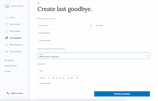 2. "Last Goodbye" option allows you to leave messages for your loved ones. Within GoodTrust’s platform, you can draft emails and record video messages for your loved ones. Once you pass away (or on any day of your choosing), GoodTrust will automatically deliver your messages. You can also draft final social media posts for platforms like Facebook and Twitter to be shared on your profile after you pass. GoodTrust is currently the only platform we reviewed that offers last goodbyes, which can be a lovely way to provide comfort to your friends and family while they’re grieving.